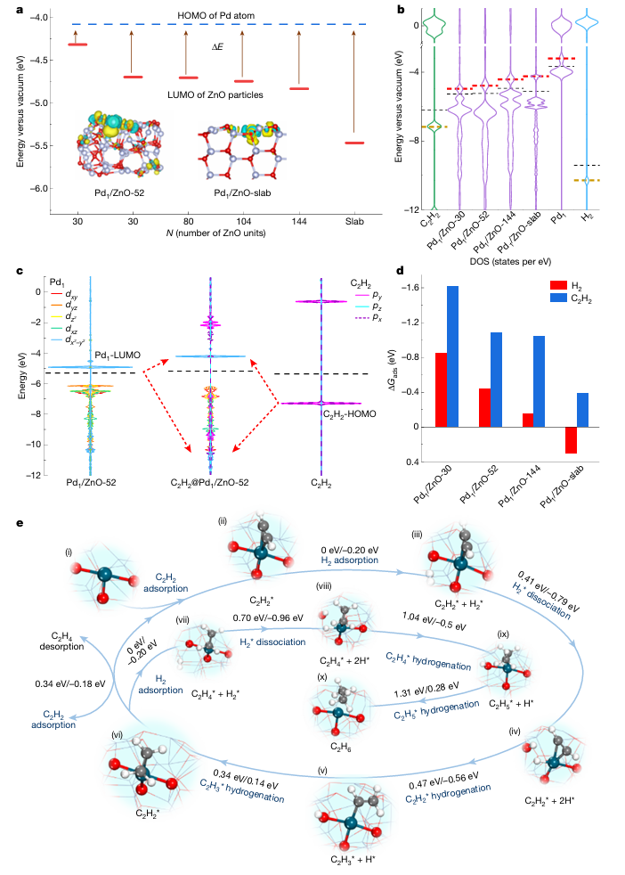 武晓君教授团队通过理论计算揭示了其内在机制:随着ZnO尺寸减小,其LUMO能级升高,禁带宽度变大,与实验结果一致。一方面,升高的ZnO LUMO缩小了与Pd HOMO的能隙,继而增强Pd-载体轨道杂化,提升了其稳定性;另一方面,Pd原子在ZnO表面成核后,负载Pd原子的LUMO能级随ZnO尺寸减小而诱发的增强的Pd-载体轨道杂化而逐步降低。这使得其与乙炔和氢分子HOMO能级更加匹配,从而显著增强其吸附,并提高活性(图3)。该理论结果与实验结果高度吻合,同时也与FMO理论图像相一致,展现了FMO理论在单原子催化中的可行性。与此同时,该研究也指出,半导体型载体的 LUMO 位置可作为一个统一描述符,用来预测高活性、高稳定性SACs。