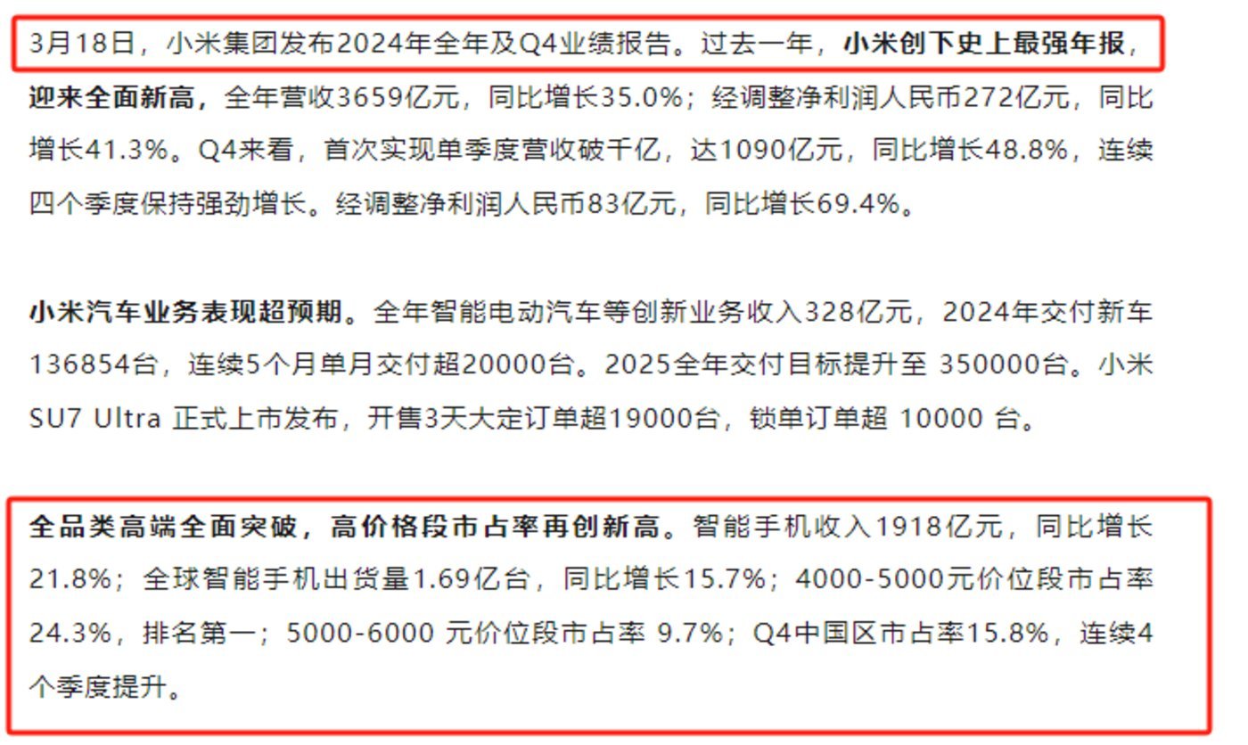 销量大增中,小米交出发布史上最强年度财报,全年智能手机业务收入大增21.8%至1918亿元新高;其中高端智能手机出货量占比达23.3%,同比提升3.0个百分点。