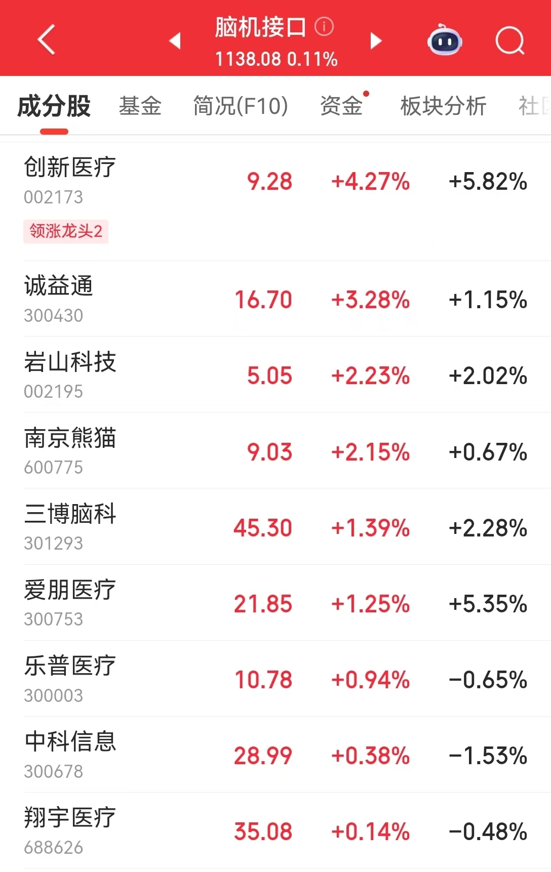 4月18日,脑机接口板块盘中异动拉升。创新医疗一度涨超6%,诚益通、岩山科技均有不同程度拉升。