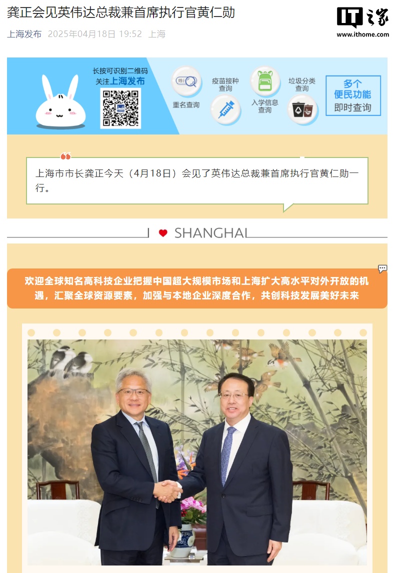 IT之家 4 月 18 日消息,据“上海发布”官方公众号今日晚间消息,上海市市长龚正今天(4 月 18 日)会见了英伟达总裁兼首席执行官黄仁勋一行。