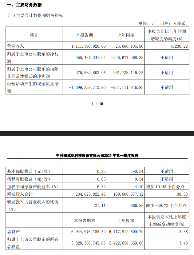 IT之家 4 月 18 日消息,寒武纪今晚发布公告:今年第一季度营收为 11.11 亿元,同比增长 4,230.22%;净利润为 3.55 亿元,而去年同期净亏损 2.27 亿元;研发投入占比 21.11%。
