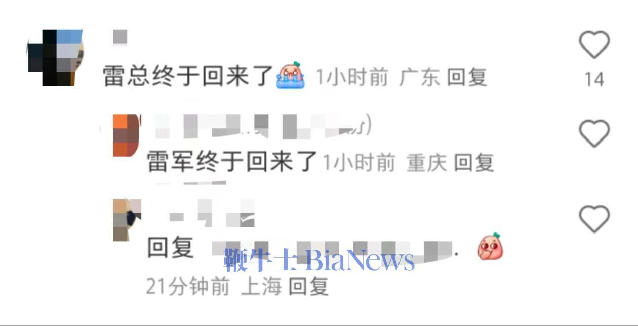鞭牛士发现,不管是在小红书还是抖音上,都有不少网友评论称“雷总终于回来了”。