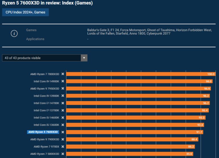 AMD 锐龙 5 7600X3D 处理器在游戏方面,要比 7900X3D、9700X 以及 5800X3D 都快,不过略慢于英特尔 13600K 和 14600K 处理器。