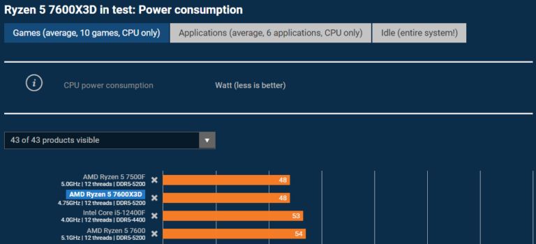 AMD 锐龙 5 7600X3D 处理器的优势体现在功耗上,在测试 10 款游戏之后,游戏功耗方面排名第二,平均功耗为 48W,在应用方面是最省电的处理器。