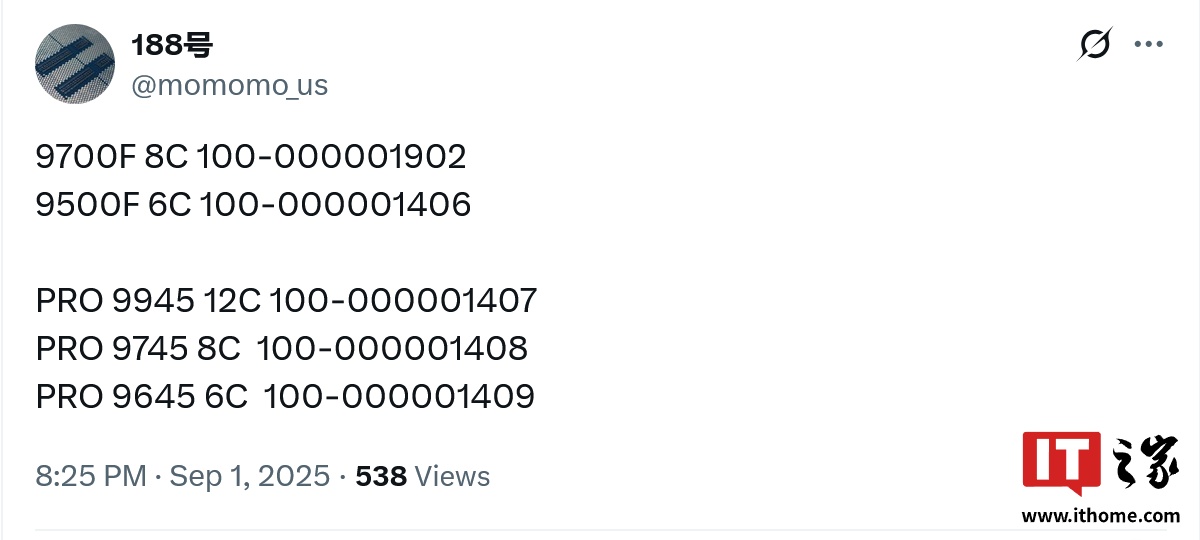 IT之家 9 月 1 日消息,消息人士 188 号 (@momomo_us) 今晚分享了 AMD 锐龙 9000F 无核显处理器和锐龙 PRO 9045 商用处理器的产品 ID。而根据产品 ID 搜索,这些产品中已有部分型号上线海外电商平台,显示目前距离正式发布并不遥远。