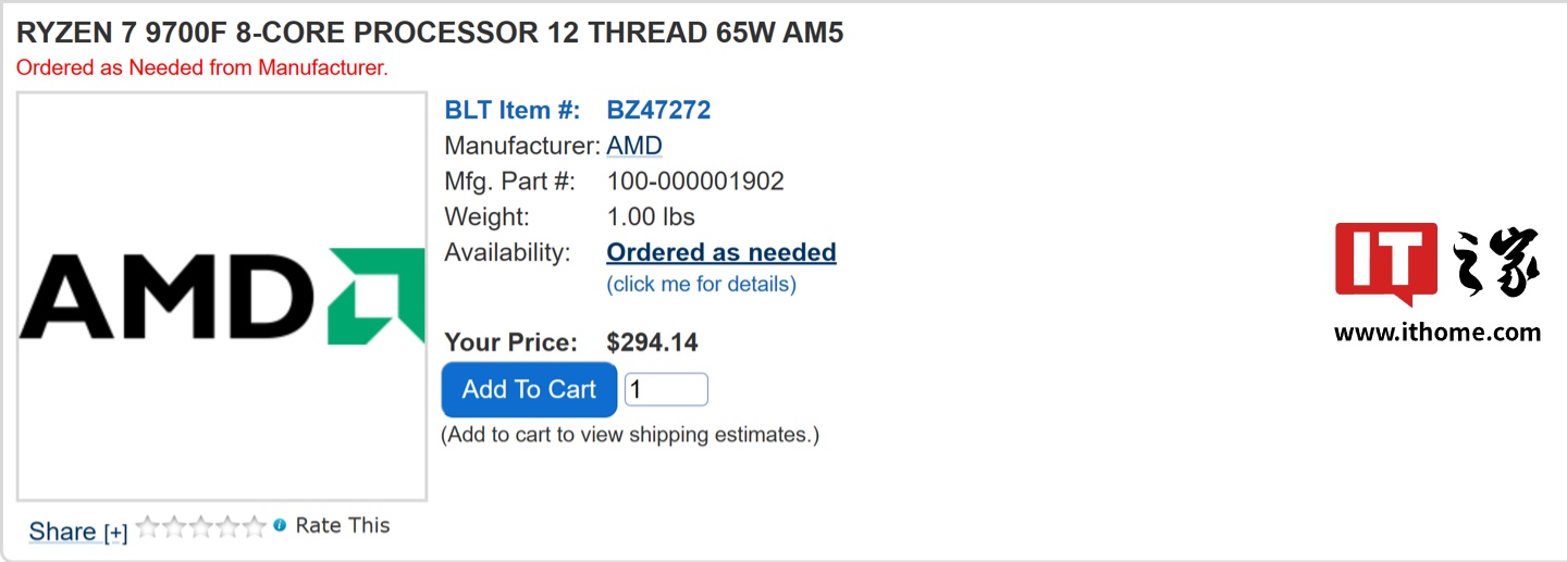 其中在锐龙 9000F 部分,X 平台用户 포시포시 (@harukaze5719) 发现美国电商 ShopBLT 同时上架了 8 核心的锐龙 7 9700F 和 6 核心的锐龙 5 9500F,标价分别为 294.14 美元和 217.84 美元(IT之家注:现汇率分别约合 2096 / 1552 元人民币)。