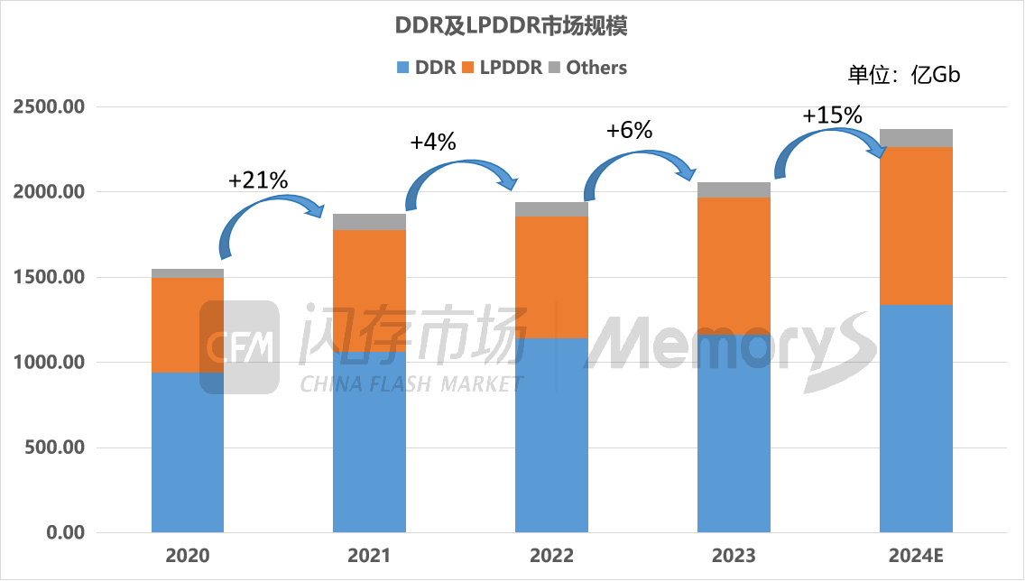 市场规模方面,根据CFM闪存市场分析,2023年全球DRAM产品bit出货量约2060亿Gb。其中,DDR产品bit出货量约1164亿Gb,约占总量的57%;LPDDR产品bit出货量约803亿Gb,约占总量的39%。