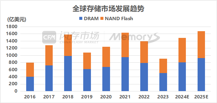 CFM预测,在存储原厂调整产能、控制供应、强势提价三大举措,以及科技企业的人工智能(AI)投资竞赛下,带动2024年全球存储市场规模涨幅将达64%至1488亿美元。其中,NAND Flash市场规模有望增长70.6%至680亿美元;DRAM市场规模有望增长58.1%至808亿美元。
