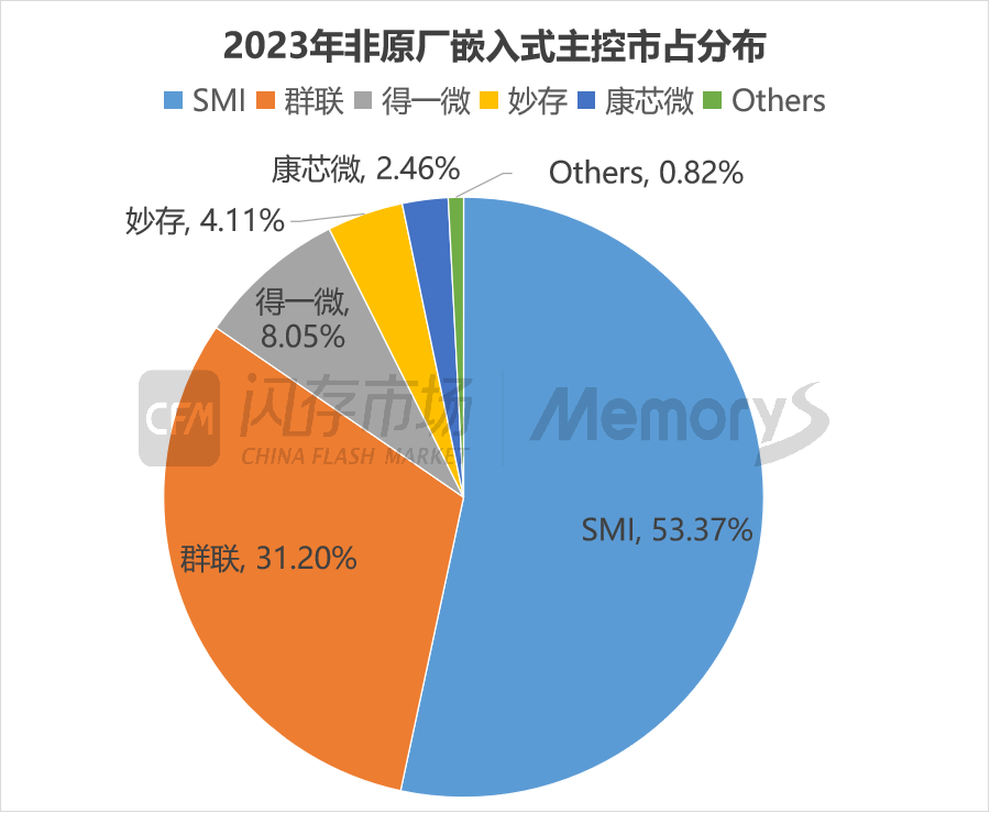 嵌入式闪存产品主要由NAND Flash和主控芯片构成,其中主控芯片负责数据在NAND Flash中的存储与读取,并提供与其他系统组件的接口。从供应角度看,在嵌入式闪存主控芯片市场,主要分为原厂与非原厂两大阵营。目前,非原厂嵌入式主控市场主要由台系厂商主导,慧荣科技和群联电子占据市场80%以上的份额。但近年来,大陆厂商也异军突起,成功地在市场中占据了一席之地。在国产存储主控芯片厂商中,得一微、珠海妙存和康芯微分别占据了市场份额的8.05%、4.11%和2.46%。