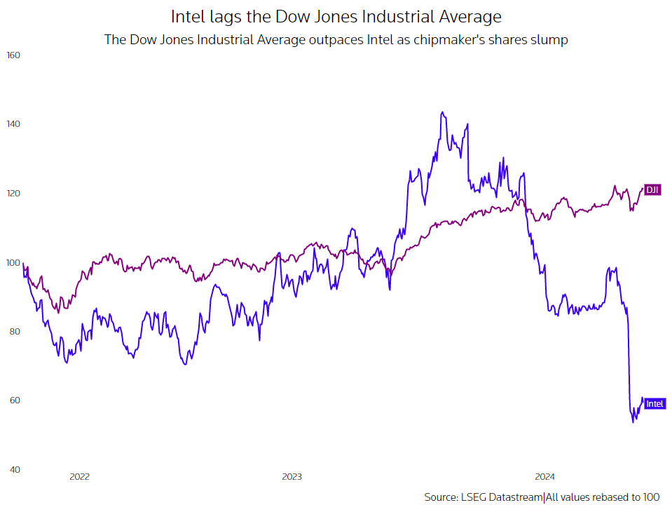 从指数中移除将损害英特尔本已受损的声誉。在放弃了对OpenAI的投资后,该公司错过了人工智能(AI)的热潮,而英特尔代工部门的亏损也在不断增加,英特尔一直在提振该部门,希望挑战台积电。
