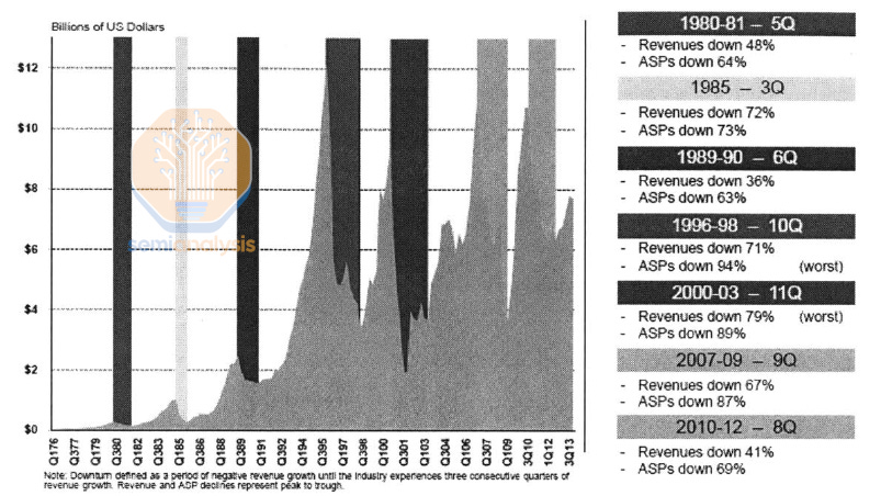 由于DRAM已经商品化,供应商本质上更容易受到价格波动的影响(与逻辑或模拟产品相比),并且在市场低迷时,他们必须主要通过商品的原始价格来竞争。逻辑电路仅通过增加成本来维持摩尔定律,DRAM则没有这种奢侈。DRAM的成本很容易衡量,即美元/GB。相对于早期,过去10年价格下降缓慢——在十年间只下降了一个数量级,而过去通常只需要一半的时间。DRAM的典型峰值和低谷也很明显。