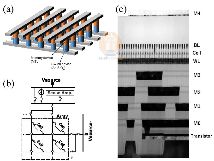 在IEDM 2022上,SK海力士和铠侠展示了间距为45nm、临界尺寸为20nm的1-selector MTJ单元。它们共同实现了迄今为止最高的MRAM密度0.49Gb/mm²,高于美光的D1β DRAM(密度为0.435Gb/mm²)。该单元甚至采用4F²设计,他们的目标是以独立封装的形式生产,作为DRAM的替代品。