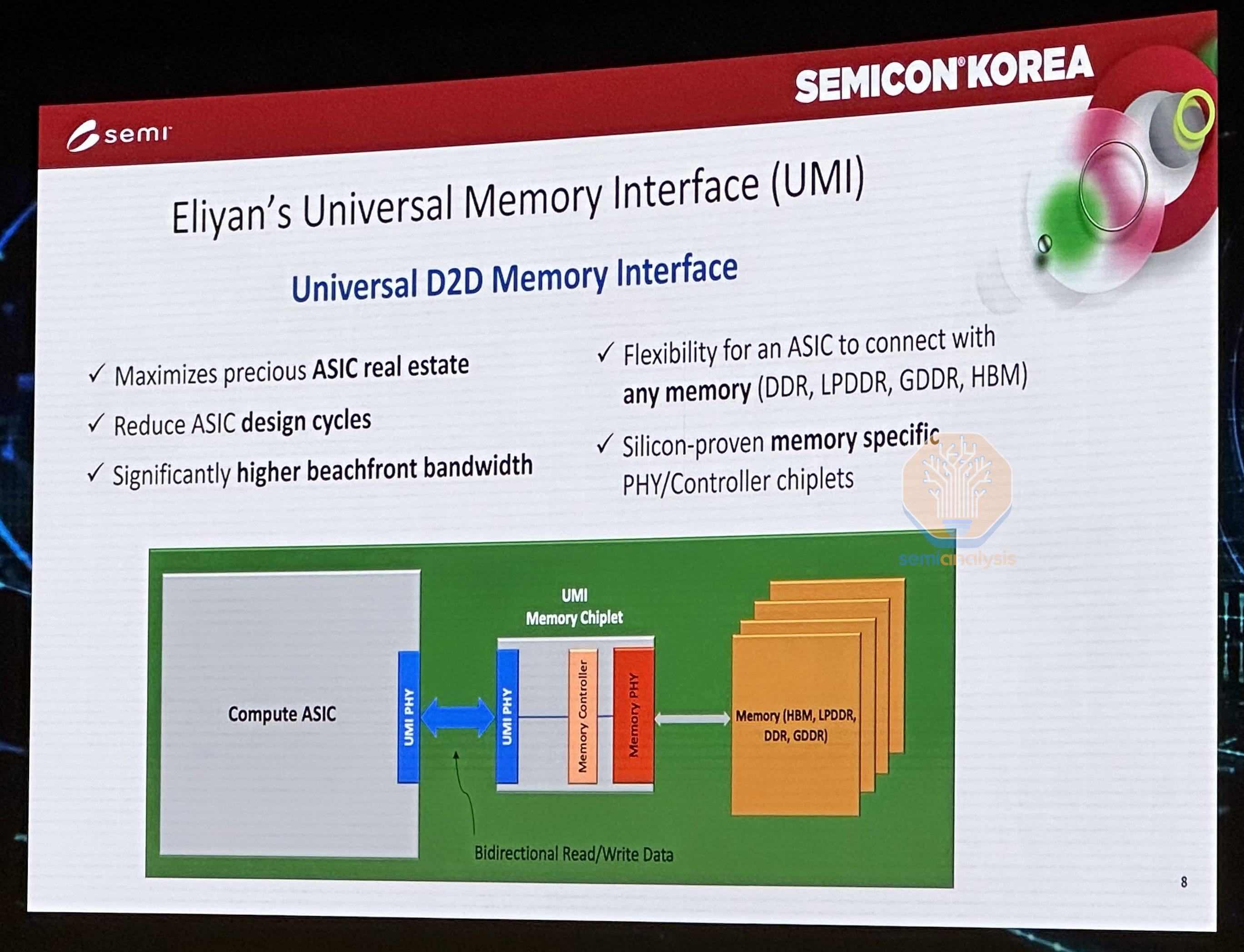 这种UMI接口与ASIC芯片一起使用,后者可用作HBM堆栈的基础芯片或其他内存类型的模块控制器。此芯片包含内存控制器和内存芯片的物理互连(PHY)。UMI外部连接到主机GPU,与主机的结构相连。它们采用全CMOS工艺制造,可以快速高效地使用先进的“Nulink”协议连接到主机,并消除主机硅片上的内存控制器占用空间。