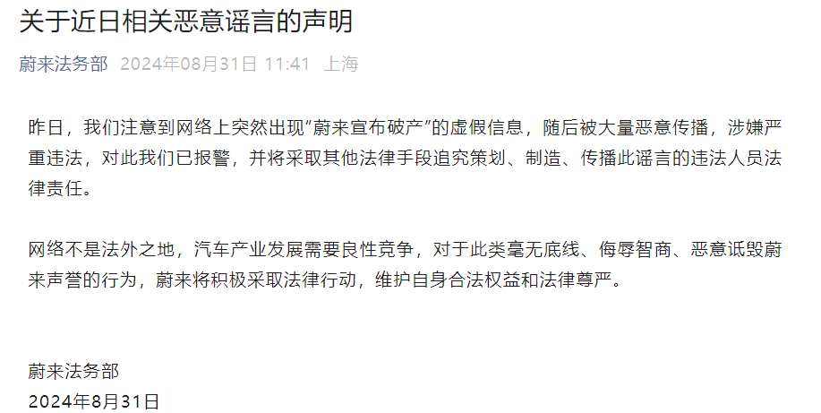 8月31日,蔚来法务部官微发布“关于近日相关恶意谣言的声明”。声明表示,昨日,注意到网络上突然出现“蔚来宣布破产”的虚假信息,随后被大量恶意传播,涉嫌严重违法,对此已报警,并将采取其他法律手段追究策划、制造、传播此谣言的违法人员法律责任。