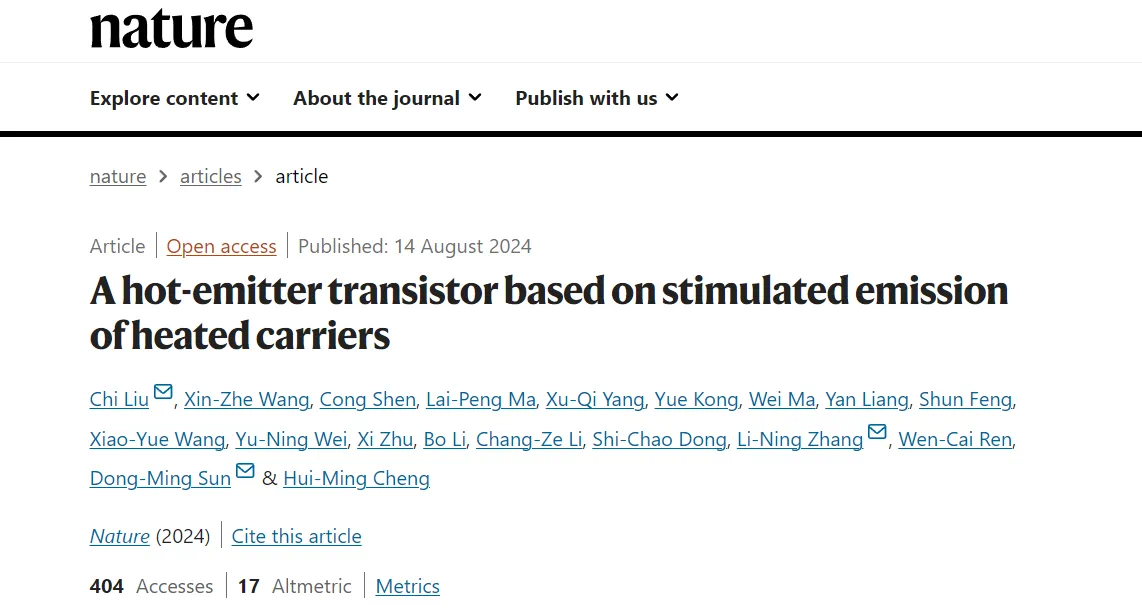 2024年8月14日,北大深圳研究生院信息工程学院张立宁助理教授团队联合中国科学院金属研究所研究员刘驰、孙东明、任文才和中国科学院院士成会明团队合作完成的研究论文“A Hot-Emitter Transistor based on Stimulated Emission of Heated Carriers”在Nature发表。该研究成功报道了一种新机制的半导体器件,该器件成为热载流子晶体管家族的新成员,为后摩尔时代的低功耗和多功能器件设计提供了新的思路。