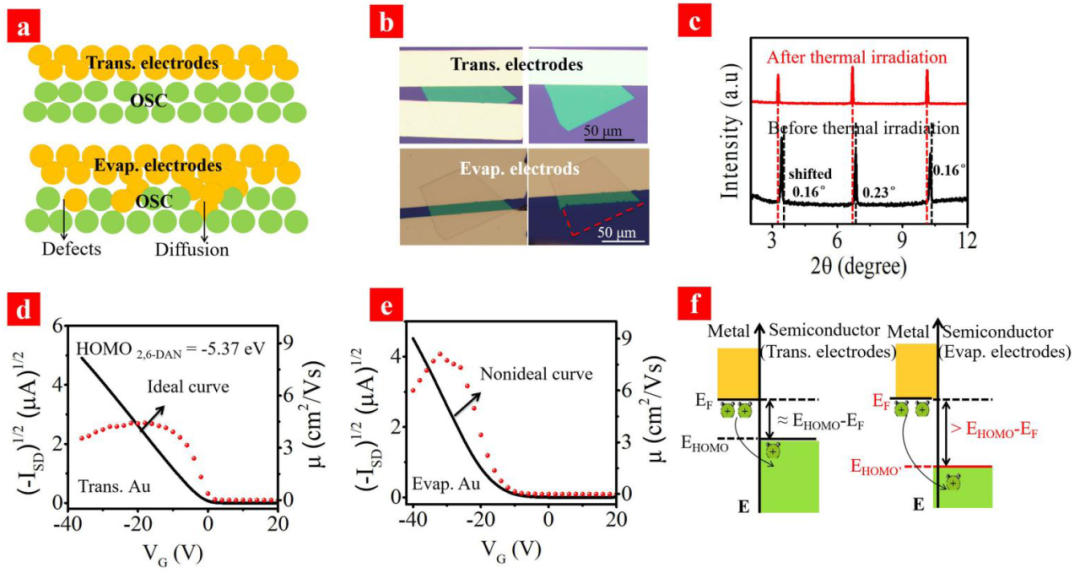 电极-有机单晶半导体界面加工技术研究与改进:为了更好的说明上述问题和改进现有电极-有机半导体界面加工技术以获得理想的有机OFETs,我们利用物理气相沉积技术制备了三种不同功函数的高质量有机单晶材料。首先在同一块2,6-二(蒽-2-基)萘(2,6-DAN, HOMO≈5.37 eV)单晶上依次利用被广泛研究地可转移技术和热蒸镀技术制备了金源漏(Ff ≈ 5.2 eV)电极。基于XRD, 缺陷态密度和界面势垒等参数表征和提取,发现传统热蒸镀技术会在电极-有机半导体界面引入晶格缺陷和无序,费米钉扎等不良效应,因此器件往往呈现出较高的接触电阻和缺陷态影响,进而引起非理想的电学行为和电学参数的错误评估。相较而言,可转移电极技术因其“非创伤”的电极-半导体界面可以高效地避免界面接触电阻影响和额外引入地材料缺陷,在获得理想的单晶器件更具优势。