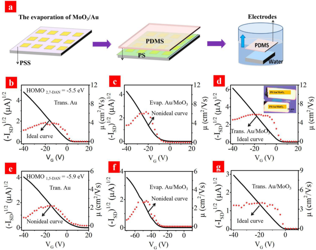 然而,随着单晶材料多样化的发展需求,其功函数跨度较大,因此Au, Ag等常规电极材料难以与有机材料实现良好功函匹配, 进而引入高的接触电阻造成器件的非理想性。为了解决上述问题,我们发展了一种可转移的掺杂电极概念有望解决电极-有机半导体界面诱发的非理想器件。该策略在转移电极技术的基础上(图中为本工作中采用的湿法转移技术,亦课拓展到干法转移技术),进一步利用了掺杂效应(MoO3等)对电极进行功函数的精准调制,有望拓展现有转移电极技术的应用广度。具体研究中基于2,7-二(蒽-2-基)萘(2,7-DAN, HOMO≈5.5 eV)和1,5-二(蒽-2-基)萘(1,5-DAN, HOMO≈5.9 eV)有机单晶,进一步利用不同MoO3掺杂厚度的金电极构筑了上述单晶器件,印证了该方案的可行性和高效性。