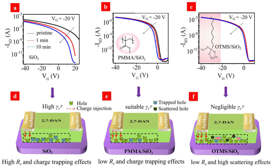 绝缘层-有机单晶半导体界面匹配性研究:基于优化后的电极-半导体界面加工技术,我们进一步量化研究了绝缘层界面参量对器件理想性的影响。实验中采用干净的SiO2,OTS,OTMS,PMMA修饰的SiO2,共4种绝缘层,随后在上述绝缘层上批量制备了2,7-DAN有机单晶器件。基于偏压应力测试,各电学参数提取、电学曲线测量,接触角测试,界面极性分量,表面能等界面参数表征,结果表明绝缘层表面极性(γsp)对单晶OFETs理想性的“双刃剑”效应,即具有较低γsp的绝缘层界面(例如OTS和OTMS修饰的器件)可以提高迁移率,但γsp过低会导致由于电荷散射效应显著而降低器件的理想特性(尤其是在高迁移率的单晶器件中)。此外,过高的γsp会引起显著的界面陷阱效应和接触电阻影响,因此,采用适宜的界面极性的绝缘层是构建理想的单晶OFETs的另一要素。