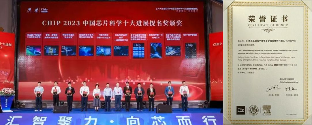 8月31日,《CHIP》2024年芯片大会暨“中国芯片科学十大进展”颁奖典礼活动举行。北京工业大学信息科学技术学院电子科学与技术系教师刘博研究成果“基于忆阻器时空变化的硬件物理熵源在密码学研究中的应用”荣获“Chip 2023中国芯片科学十大进展提名奖”。