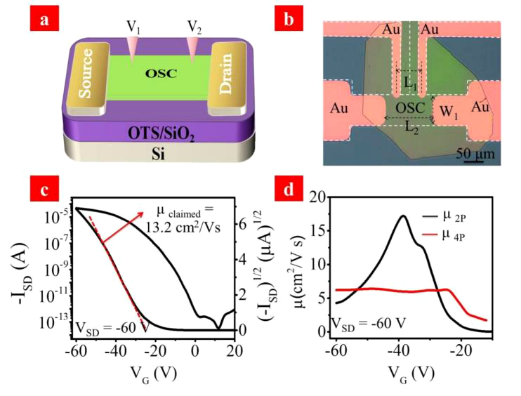 传统MOSFET提取模型的不适性:这项研究工作中首先基于传统的热蒸镀电极技术制备了非理想I-V曲线的有机单晶OFETs,随后分别利用栅四探针技术 (gFPP)和传统MOSFET模型提取了器件的迁移率,其中gFPP技术是一种不受器件接触电阻影响的复杂测试架构。结果表明传统MOSFET提取方法由于传统电极制备技术引入的接触电阻等影响,会对这类非理想器件的迁移率进行错误的评估(高估)。