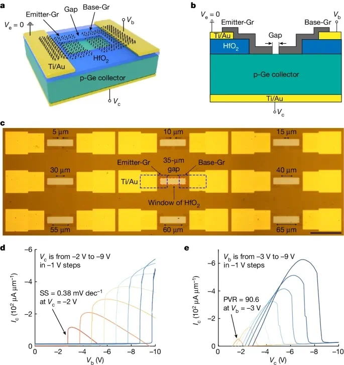 团队成员提出一种具有“受控调制热载流子”特征的新型热载流子发射机制,并基于低维材料制备了器件的原型,显著提升热载流子晶体管的性能和功能。具体来说,构建了混合维度石墨烯/锗的双肖特基结构热发射极晶体管。该晶体管利用新型热载流子生成机制,即加热载流子的受激发射机制,载流子由石墨烯基极注入、扩散到发射极并激发其中被电场加热的载流子,显著增强了热载流子电流。相关工作机制通过数据分析结合仿真辅助进行探索论证及建模研究。基于这种机制的器件产生了显著的特性:其一是超陡的摆幅,突破玻尔兹曼极限,亚阈值摆幅低于1mV/dec;其二是在室温下获得了峰谷电流比超过100的负微分电阻;其三是具有多值逻辑的功能。该项工作揭示了半导体晶体管的新型工作机制,为后摩尔时代微电子器件技术的发展提供了一种全新的思路。