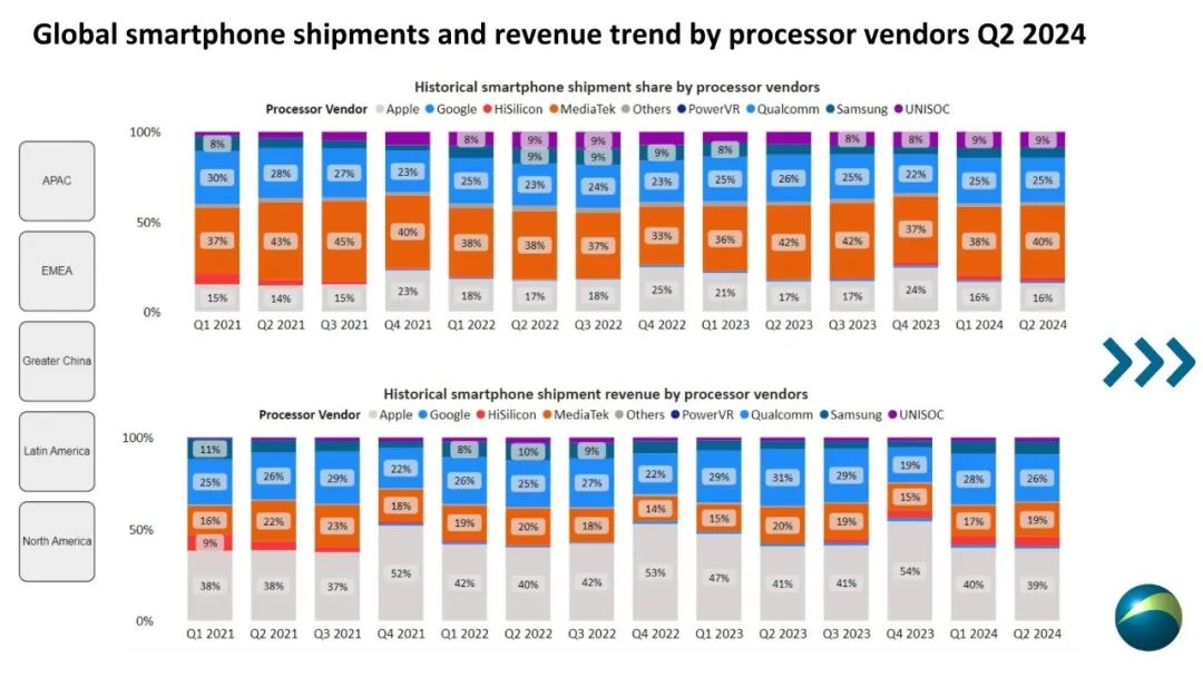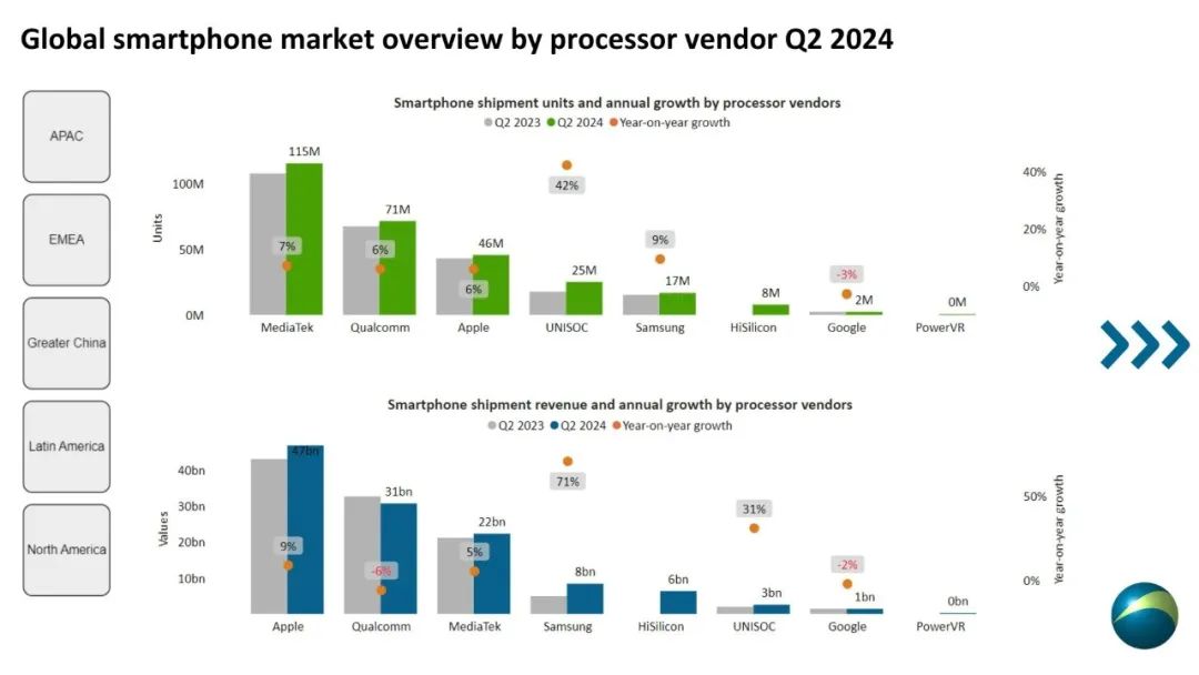 具体来说,2024年第二季度,基于联发科处理器的智能手机出货量同比增长7%至1.153亿台,市场份额高达40%,排名第一;销售额增长5%至220亿美元,市场份额为19%,排名第三。