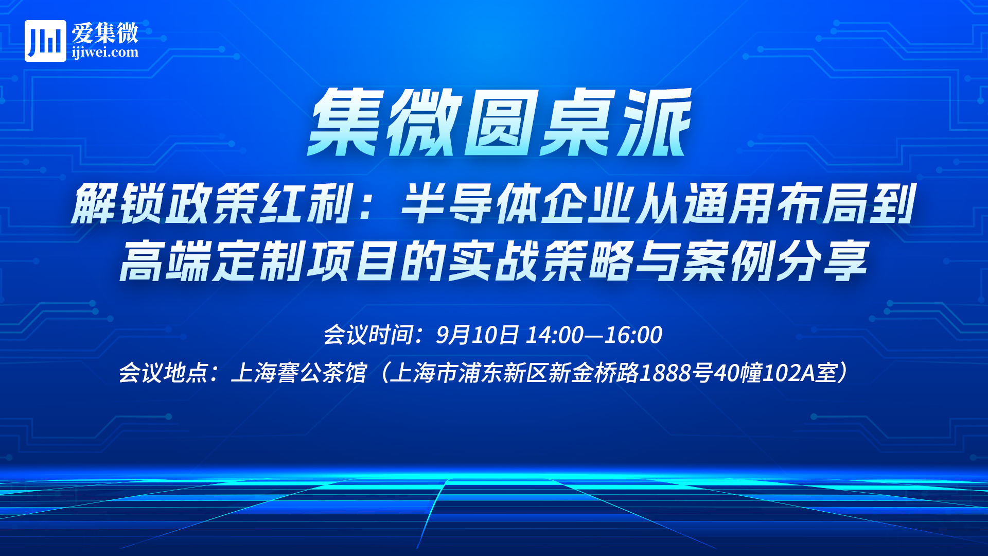 政策红利如同灯塔,为企业的航行指引方向。本次“解锁政策红利:半导体企业从通用布局到高端定制项目的实战策略与案例分享”沙龙活动,正是您把握时代脉搏、加速转型升级的绝佳契机。在这里,您将不仅获得政策解读的钥匙,更能汲取实战策略的精髓,激发创新思维,为企业的未来发展铺设坚实的基石。爱集微诚挚邀请每一位半导体企业的领航者,共赴这场智慧与机遇的盛宴。让我们在謇公茶馆相聚,共同解锁政策红利,引领半导体产业迈向更加辉煌的明天!
