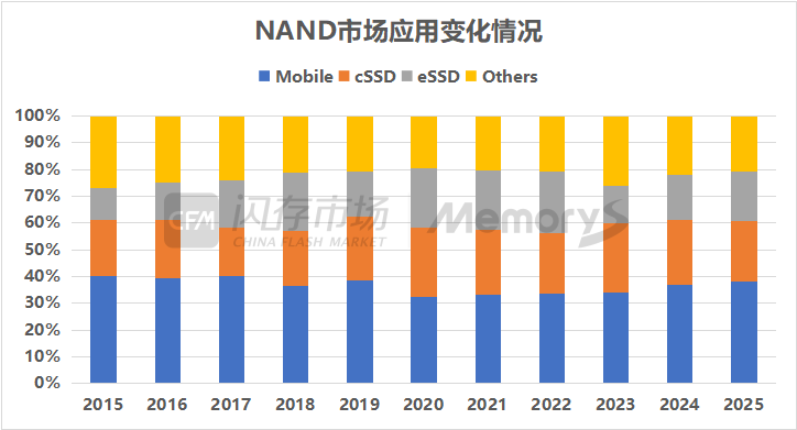 在应用层面,CFM报告指出,服务器、PC、手机仍是存储芯片三大主力市场。具体来看,2023年,以PC应用为主的cSSD消耗了NAND Flash的26%,手机产品消耗了NAND Flash产能的34%,以服务器应用为主eSSD消耗了NAND Flash总产能的14%,三类应用占据NAND Flash总产能的74%。