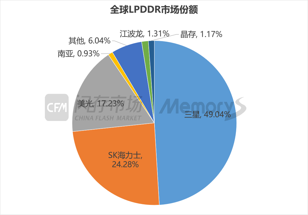 在市场份额方面,LPDDR市场目前主要由三大存储原厂——三星、SK海力士和美光主导,这三家公司共同占据90%的市场份额。不过近年来,国内存储制造商也在积极进军LPDDR市场,发展迅速并取得了初步成功。在国产LPDDR厂商中,江波龙和晶存科技分别在全球LPDDR市场中占据1.31%和1.17%的份额。