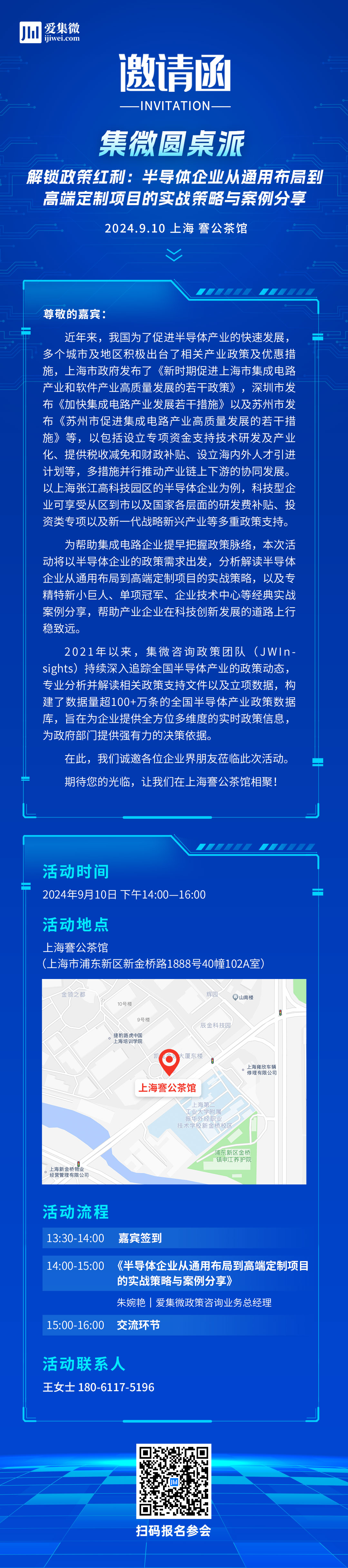 正是在这样的背景下,一场旨在助力半导体企业洞悉政策先机、解锁红利蓝海的沙龙活动——“解锁政策红利:半导体企业从通用布局到高端定制项目的实战策略与案例分享”应运而生。在此,诚挚地邀请半导体企业GR或企业高管参加由爱集微在謇公茶馆举办的线下沙龙活动,在当前全球科技产业变革与国家政策导向并行的关键时期,激活加速企业转型升级与高端化发展的芯力量。