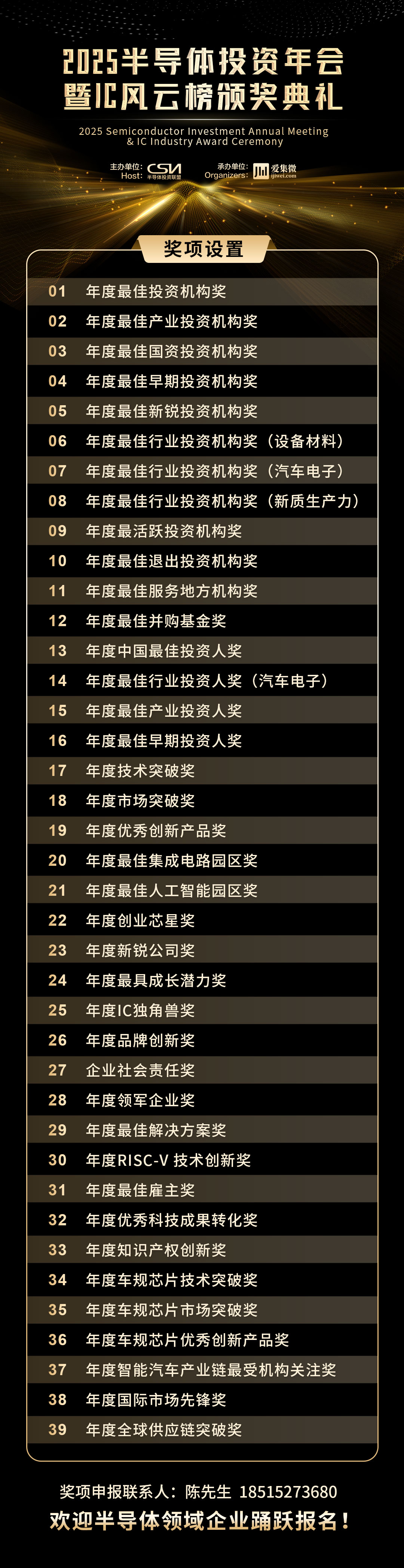 1.获奖企业实现资本飞跃!2025半导体投资年会暨IC风云榜颁奖典礼39项大奖申报开启;