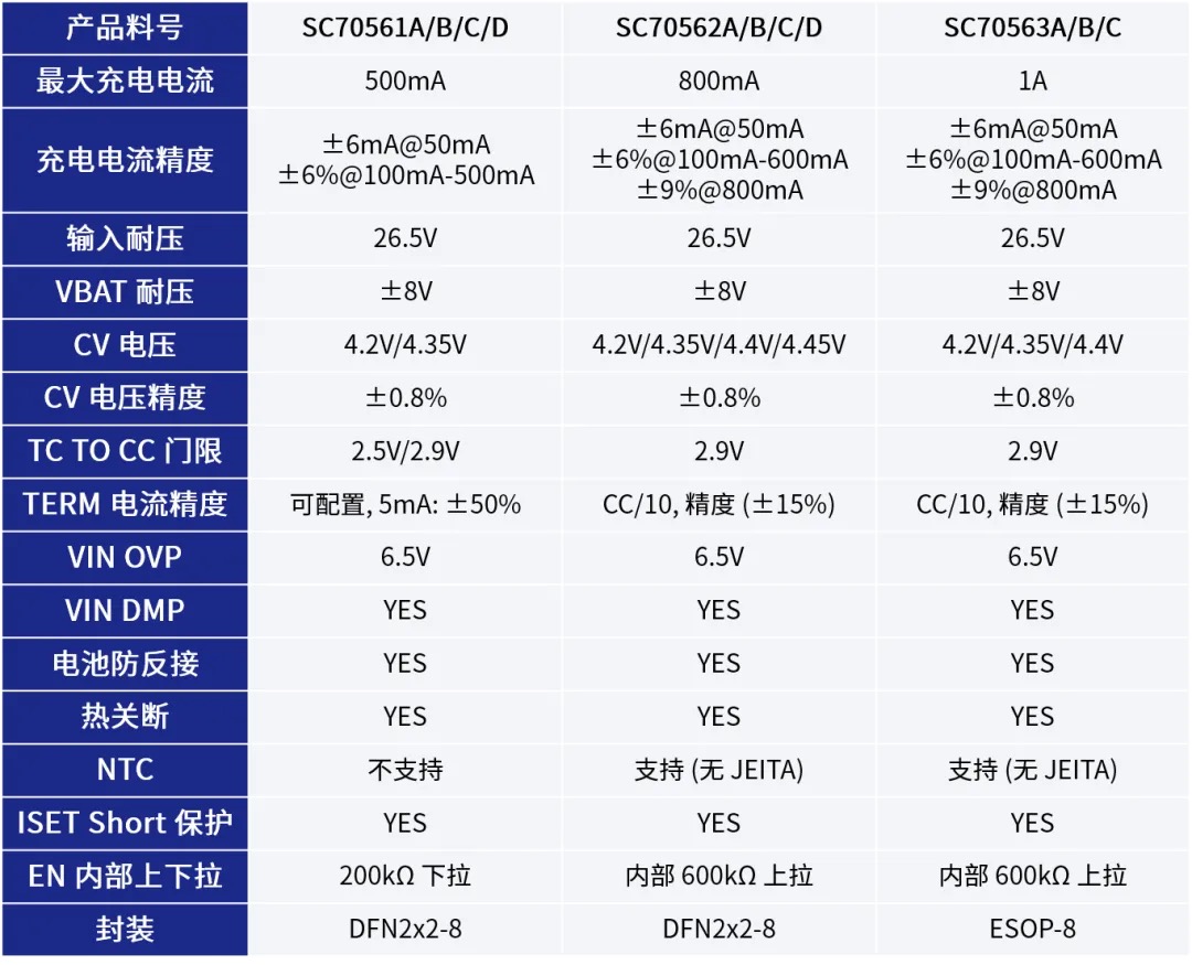 SC7056x 产品系列包含 SC70561x、SC70562x、SC70563x 三款型号。具体性能对比如下表所示: