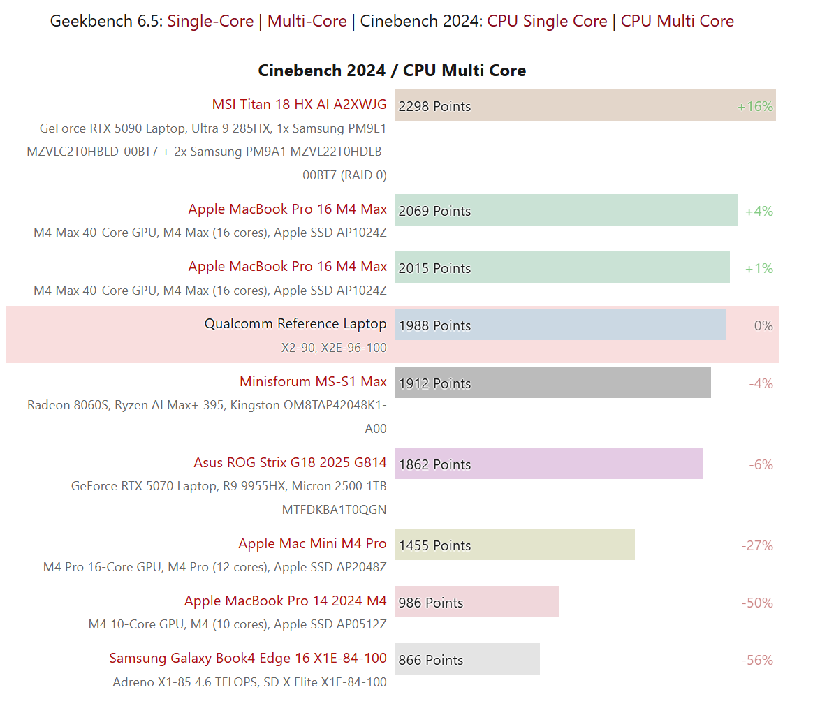在多核成绩方面,骁龙 X2 Elite Extreme 的跑分为 23491 分,比苹果 M4 Max 慢 9%,但比 AMD 锐龙 AI Max+ 395 和英特尔酷睿 Ultra 9 285HX 快 6%。