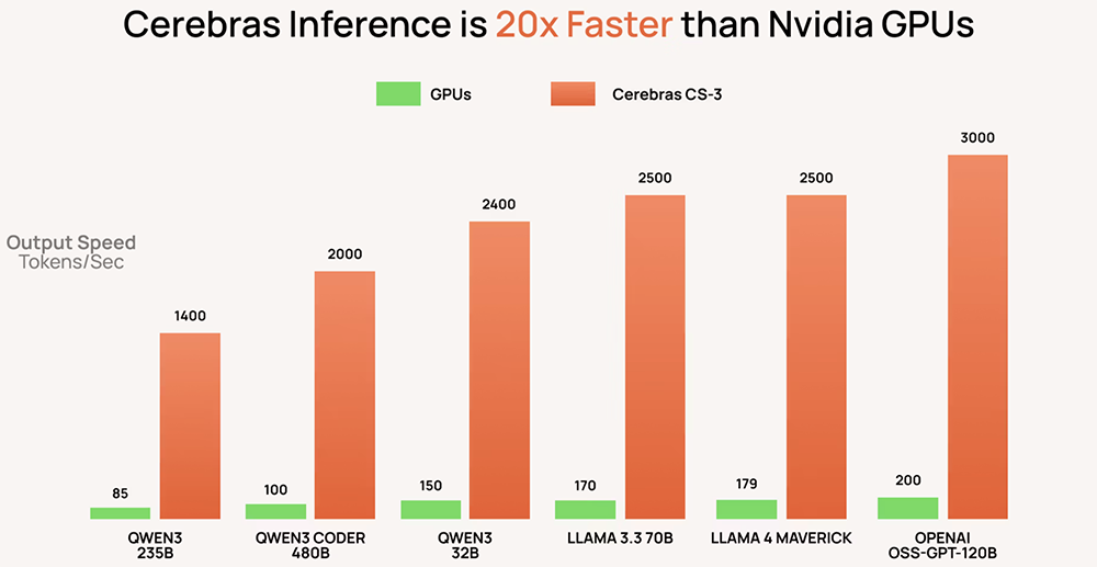 自2024年底推出推理服务以来,Cerebras发展迅速,运行开源和闭源模型的速度通常比英伟达GPU快20倍以上。