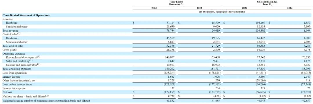 Cerebras在2022年、2023年营收分别为2462万美元、7874万美元;毛利分别为289万美元、2636万美元;运营亏损分别为1.79亿美元、1.34亿美元;净亏损分别为1.78亿美元、1.27亿美元。