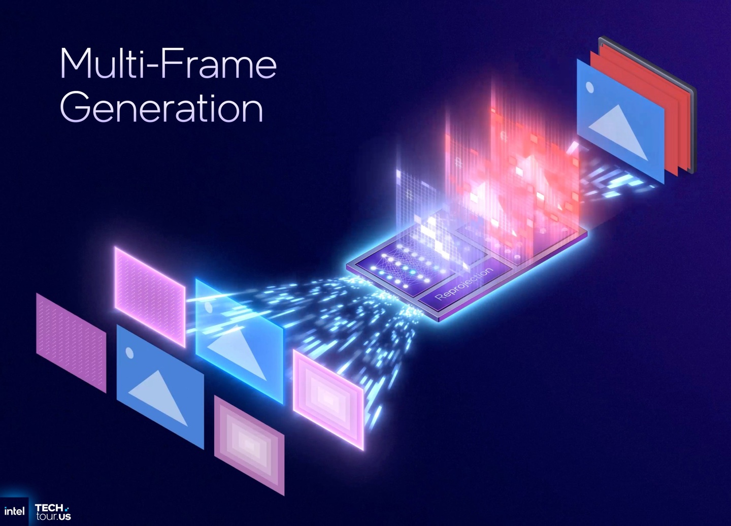 XeSS-MFG 使用原始帧作为素材,抓取运动向量和深度信息,进行光流和向量的重建,最终实现基于 AI 的多帧生成。