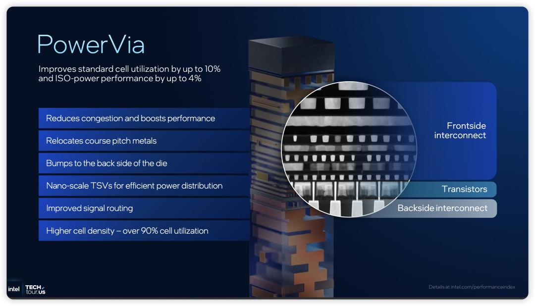 RibbonFET 解决了晶体管继续缩小时面临的漏电流问题;PowerVia 则改变了 60 年来电源线和信号线混在芯片正面的设计。相比 Intel 3 制程,Intel 18A 的能耗比上最高提升 15%,密度提升 30%。