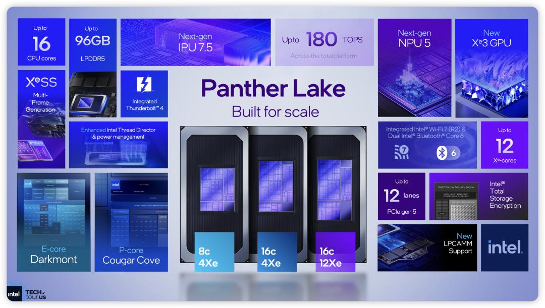 具体来讲,Panther Lake 将会有三个规格的产品推出,分别对应:
