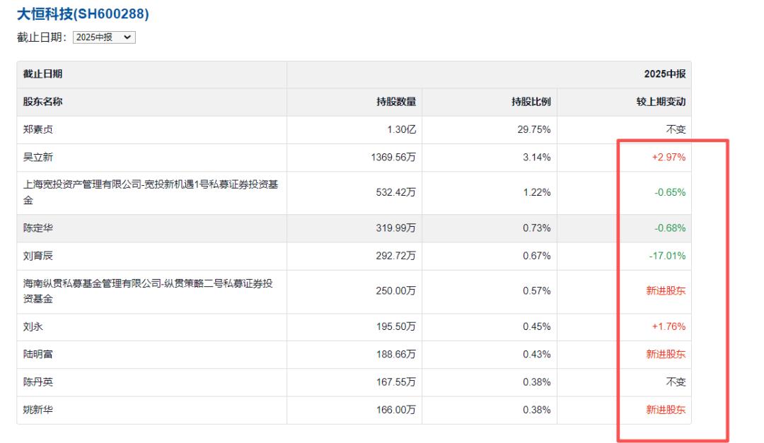 或让资本市场存在想象力的是,随着郑素贞的彻底退出,大恒科技的股东结构正在经历一场大换血。2025年中报显示,大恒科技十大流通股东发生了显著变化:3位股东新进,3位股东退出,2位股东增持,3位股东的持股减少。