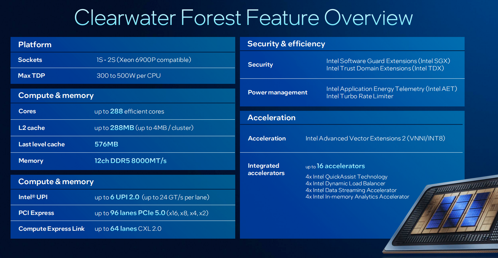 在末级缓存上,Clearwater Forest也进行了大幅提升,支持最高576MB的末级缓存(同上一代相比提升5倍)以及96条PCIe Gen 5的I/O通道,其中有64条支持最新的CXL技术。双插槽可以将一到两个Clearwater Forest放在同一个主板上,从而支持单路和双路的系统。Clearwater Forest还支持多达6个UPI的互联,可以极大提高双路CPU之间的带宽通信。