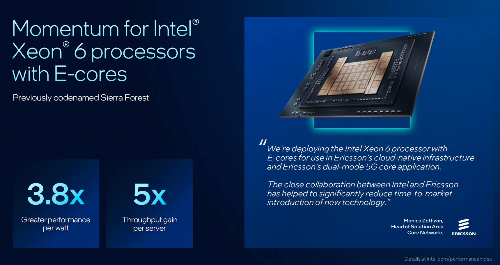 E核处理器在提升能效方面的表现非常显著,根据英特尔的数据以及合作伙伴的反馈,至强6能效E核处理器可以大幅度提高每瓦性能,达到之前的3.8倍,同时可以在单台服务器上增加5倍的吞吐量。