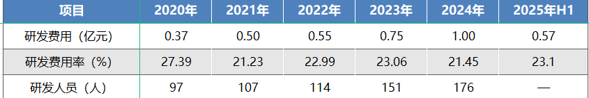 从研发费用投入来看,2020年至2025年上半年,龙迅股份在研发费用上分别为0.37亿元、0.50亿元、0.55亿元、0.75亿元、1.00亿元、0.57亿元;研发费用率(研发费用/总营业收入)27%、21.23%、22.99%、23.06%、21.45%、23.1%。公司继续加大研发投入,进一步提升研发平台硬件设施水平,壮大研发团队,优化研发体系,产品研发速度显著提升。