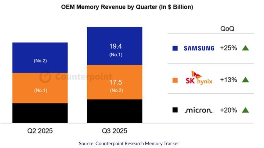 Counterpoint Research最新数据表明,三星电子第三季度重新夺回了全球存储芯片市场第一的位置。