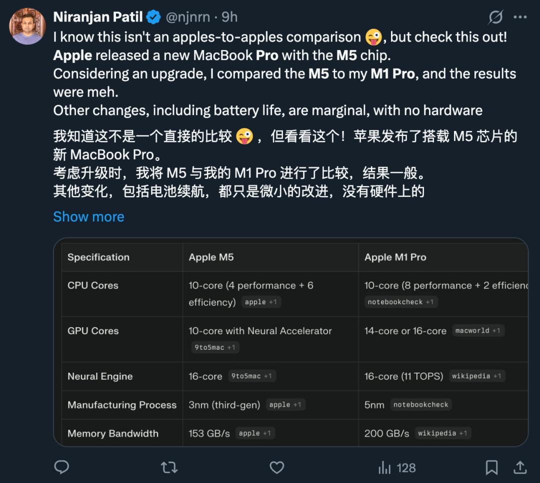 而这些人可能恰恰就是 M5 的目标群体,因为苹果的通稿中一直把 M5 的性能与 M1 对比,这让网友感到无语。
