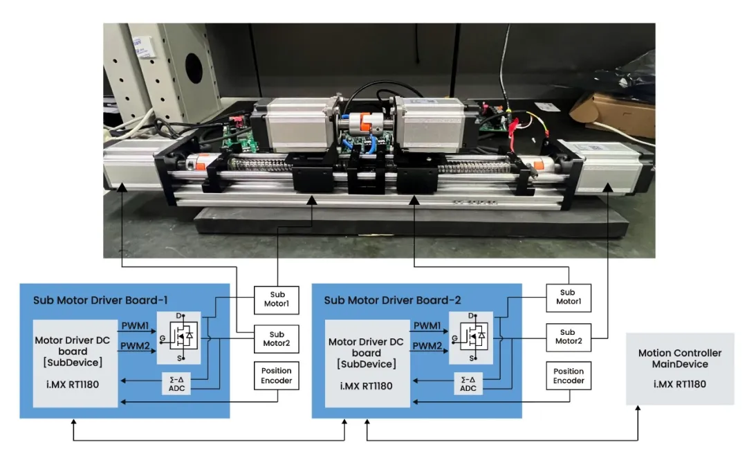 内置EtherCAT subdevice controller,相比于常规的外置控制器,拥有更低的成本,更高的PDI传输速度。恩智浦基于片内EtherCAT控制器设计了基于单颗i.MX RT1180芯片的EtherCAT+伺服电机控制方案,并通过一台滑台丝杆的齿轮对接,对该方案的性能进行了展示。