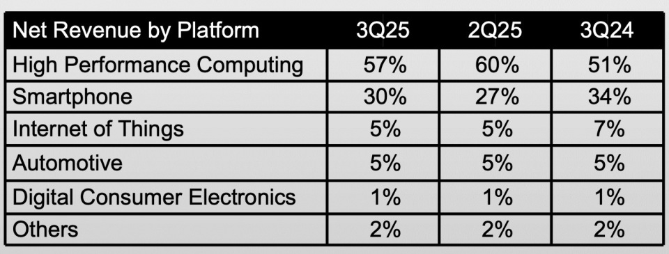 高性能运算(HPC)和智能手机分别占净营收的57%和30%