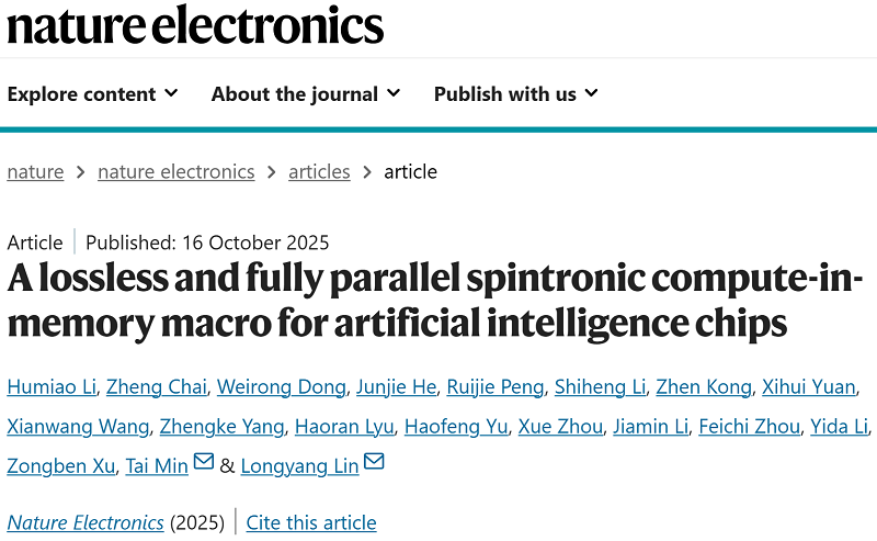 近日,南方科技大学深港微电子学院林龙扬课题组在非易失存算一体芯片领域取得重要研究进展。团队基于40纳米CMOS及STT-MRAM工艺,提出并流片验证了首个精度无损、全并行的数字式非易失存算一体芯片(nvDCIM, non-volatile Digital Compute-in-Memory),系统性解决了传统模拟式存算一体芯片在计算精度、可扩展性与鲁棒性上的瓶颈,并提出基于翻转率感知的网络训练方法以提升存算一体芯片在人工智能应用的能效。相关研究成果以“A lossless and fully parallel spintronic computeinmemory macro for artificial intelligence chips”为题发表于Nature Electronics(DOI:10.1038/s41928-025-01479-y)。研究由南方科技大学联合西安交通大学等单位共同完成,南方科技大学为论文第一单位和通讯单位。南方科技大学林龙扬助理教授、西安交通大学闵泰教授为论文的通讯作者。南方科技大学林龙扬课题组2024级博士研究生李瑚淼(南科大2018级本科毕业生,2022级硕士研究生)为论文的第一作者。