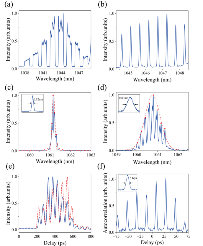 (a)和(b)光谱整形图;(c)和(d)基于四波混频的光谱转录结果图;(e)和(f)消啁啾的高分辨率激光脉冲序列