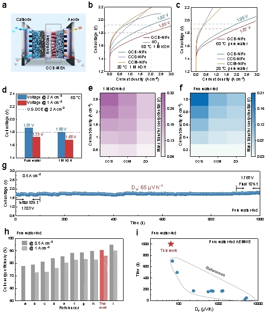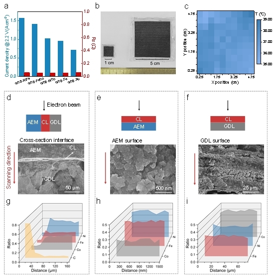 研究团队展示了限域定向沉积策略的普适性,铁(Fe)、铁钴(FeCo)、镍钴(NiCo)、镍铁(NiFe)、钌(Ru)基等多种催化剂集成至GCB-MEA中,并实现了5×5cm²大面积膜电极均匀制备。以NiFe基催化剂为例,GCB-MEA在1摩尔每升的氢氧化钾溶液(1 M KOH)中达到2.00A cm⁻²的电流密度仅需电压1.80V,在纯水中也仅需1.87V,能量转换效率高达85.7%,优于美国能源部制定的2040年目标。