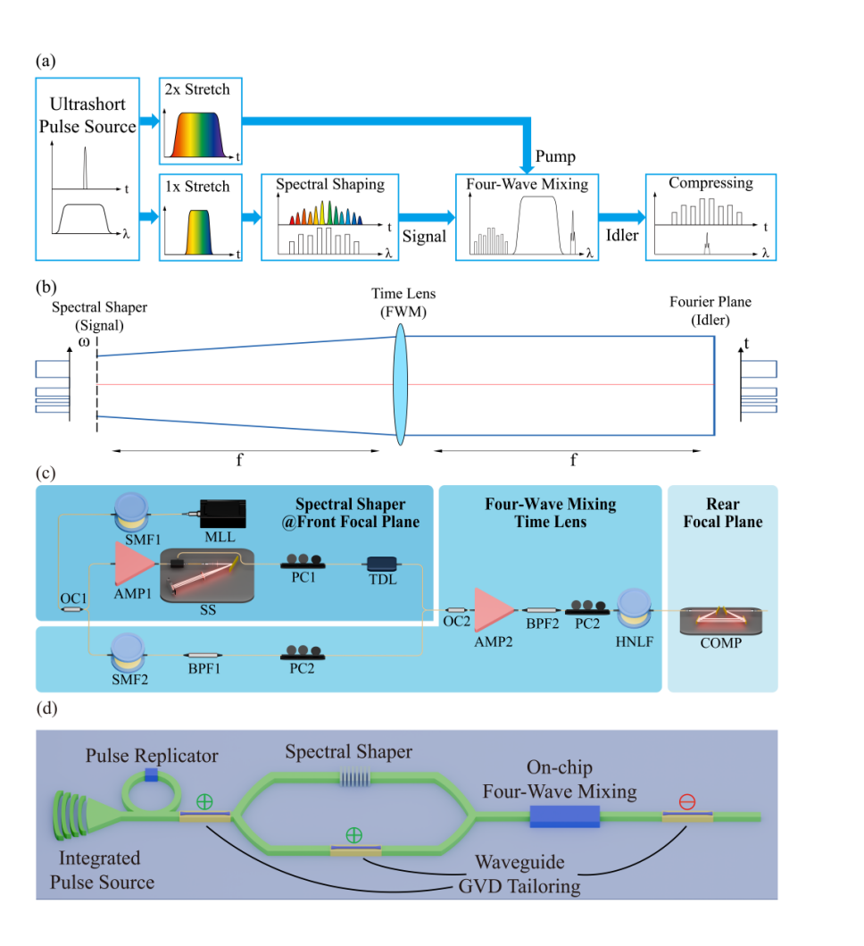 近期,中国科学院上海光学精密机械研究所研究团队,在高分辨率激光脉冲时域任意整形技术研究方面取得进展。研究团队创新性提出了基于光波导四波混频的脉冲时域任意整形技术(FOCUS),并实现了时域分辨率2ps、记录长度400ps、中心波长可调谐范围3.5nm的消啁啾脉冲序列输出。